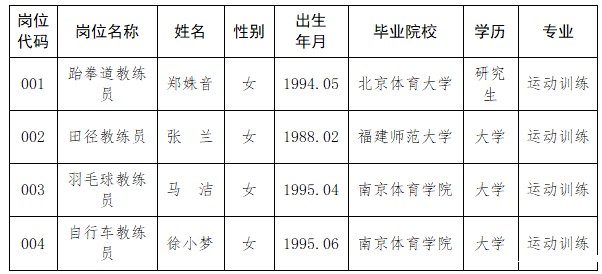 根据《2022年苏州市体育局直属事业单位公开招聘紧缺型体育教练员公告》,经过面试、体检和考核合格,拟录用以下4名同志,现公示如下: